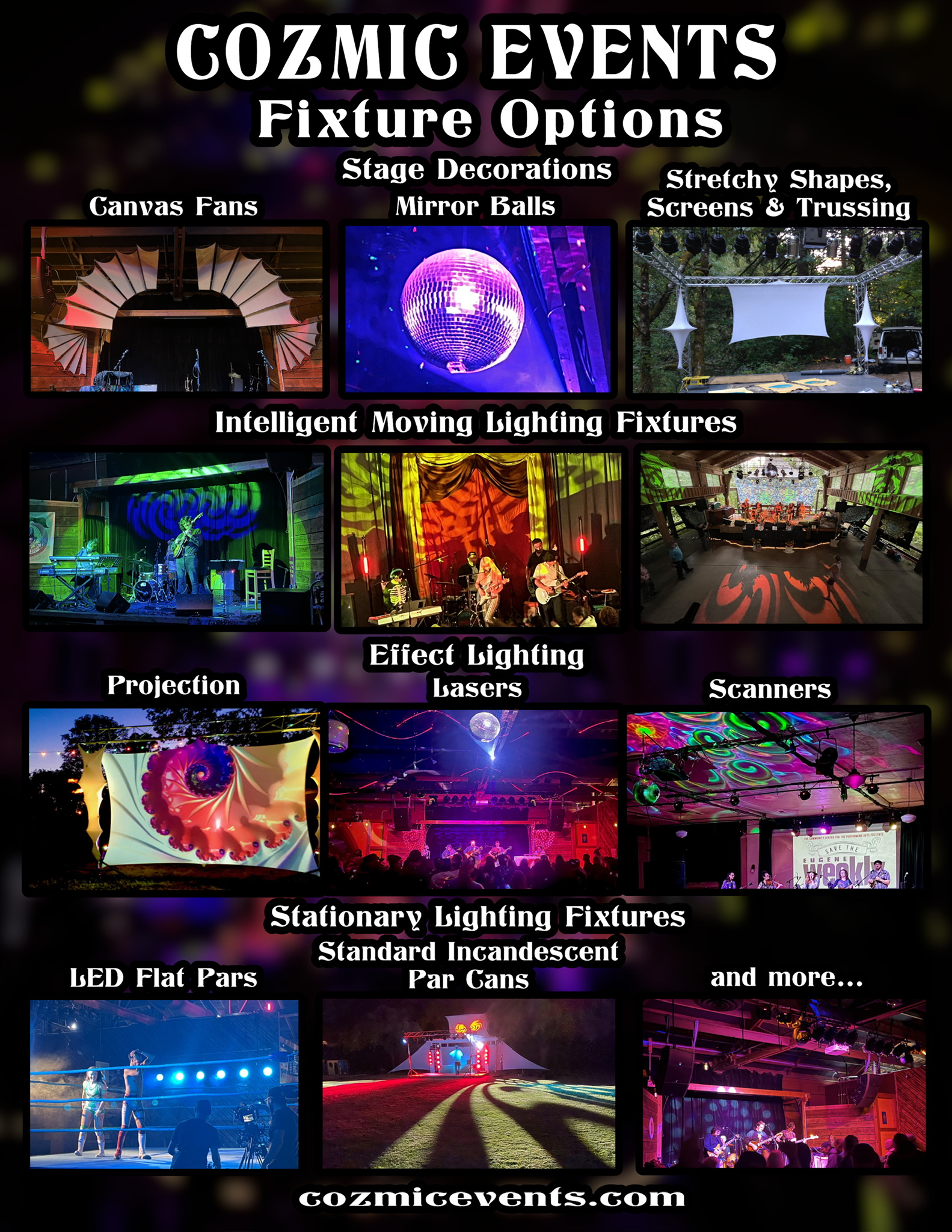 Cozmic Events offer stages, lighting, projection, lasers, and more. Our full service lighting options are suitable for any venue, large or small, and indoors or outdoors.